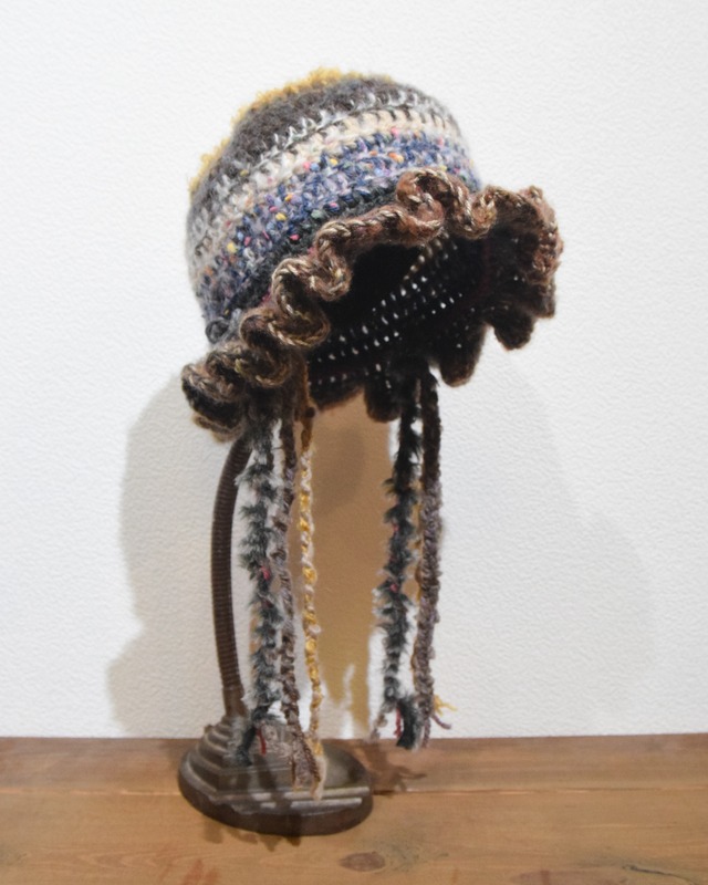 手編みのニット帽です◎ クラゲをイメージして作りました♨︎ 紐部分は取り外しができるようにしているので、付けたり外したり、お好みで楽しんで下さい★ ※フリルになっていない方が後となっています 高さ 約19cm 頭囲 約56cm つば 約4cm ヒモ 約30cm ひとつひとつ丁寧に編んでおりますが、手編みの為歪みやほつれ等生じる場合がございますのであらかじめご了承ください。 またカメラやパソコン環境の違いにより実際の色合いが異なって見える場合がございます。あらかじめご了承くだいさいませ。 商品は店頭でも同時に販売しているため、ご注文が重複してお買い上げいただけない場合がございます。何卒ご了承くださいませ。