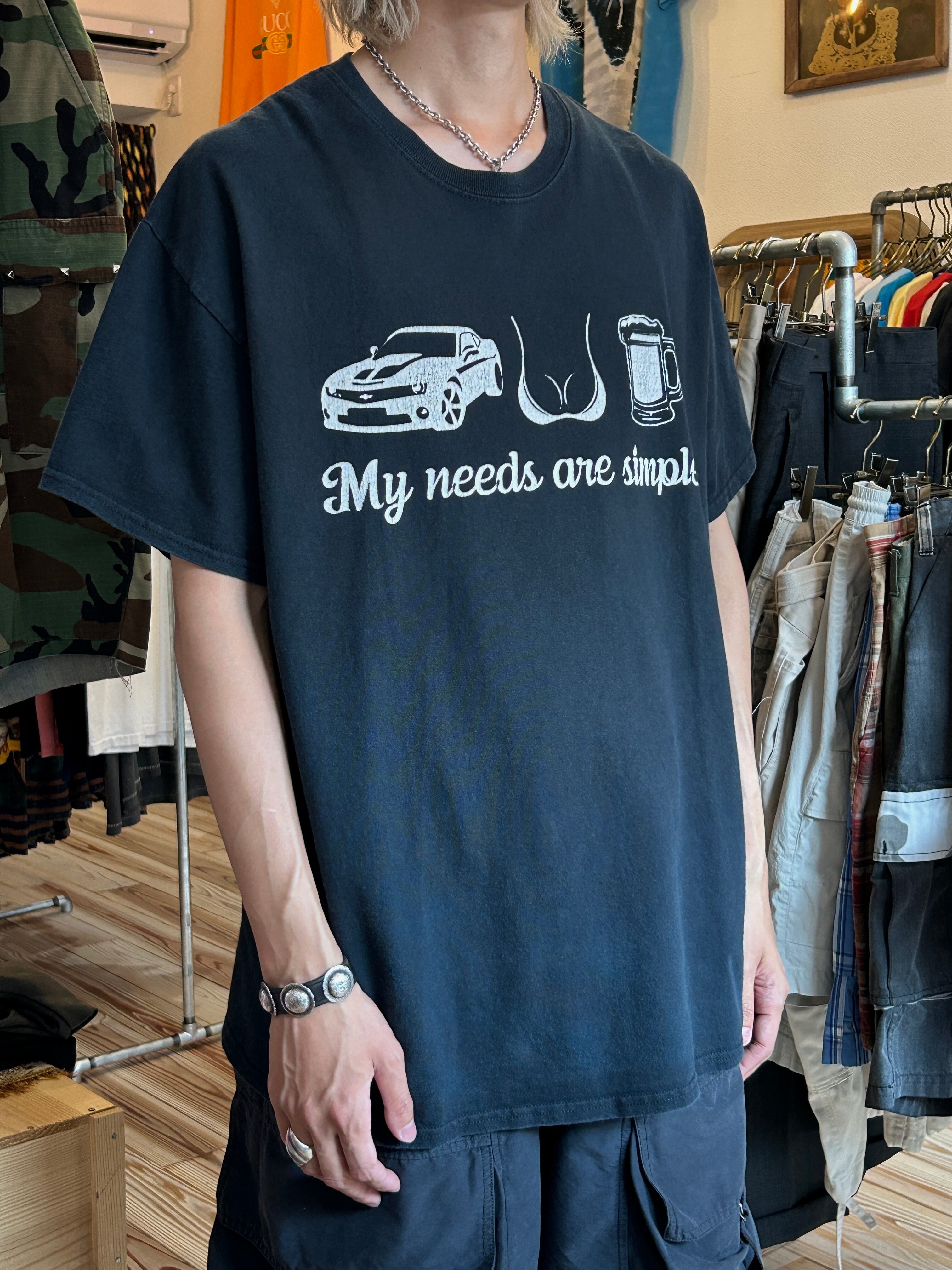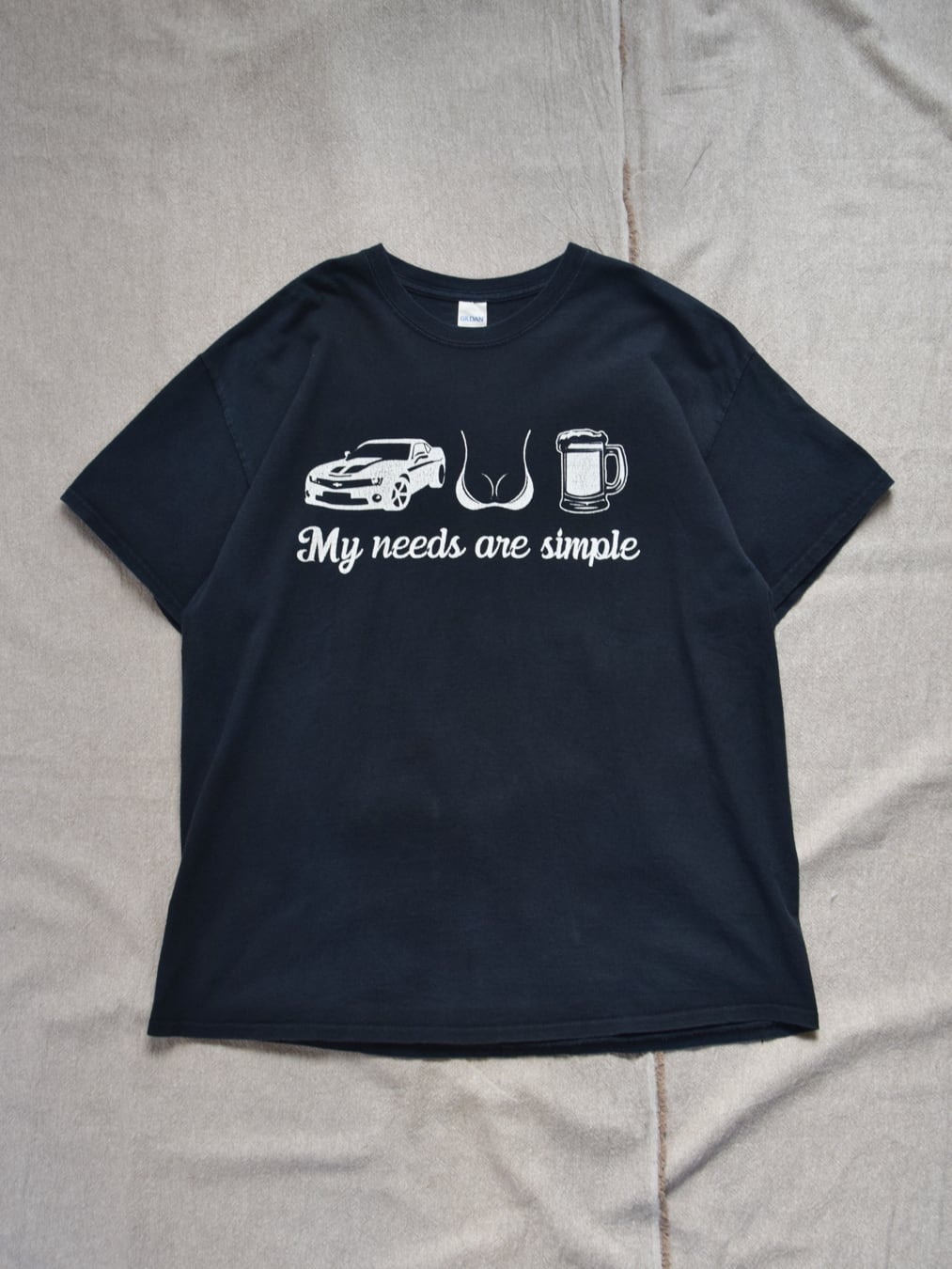 「私の必要なものは単純です」の文字と車、女性の胸元、ビールがプリントされたTシャツ。