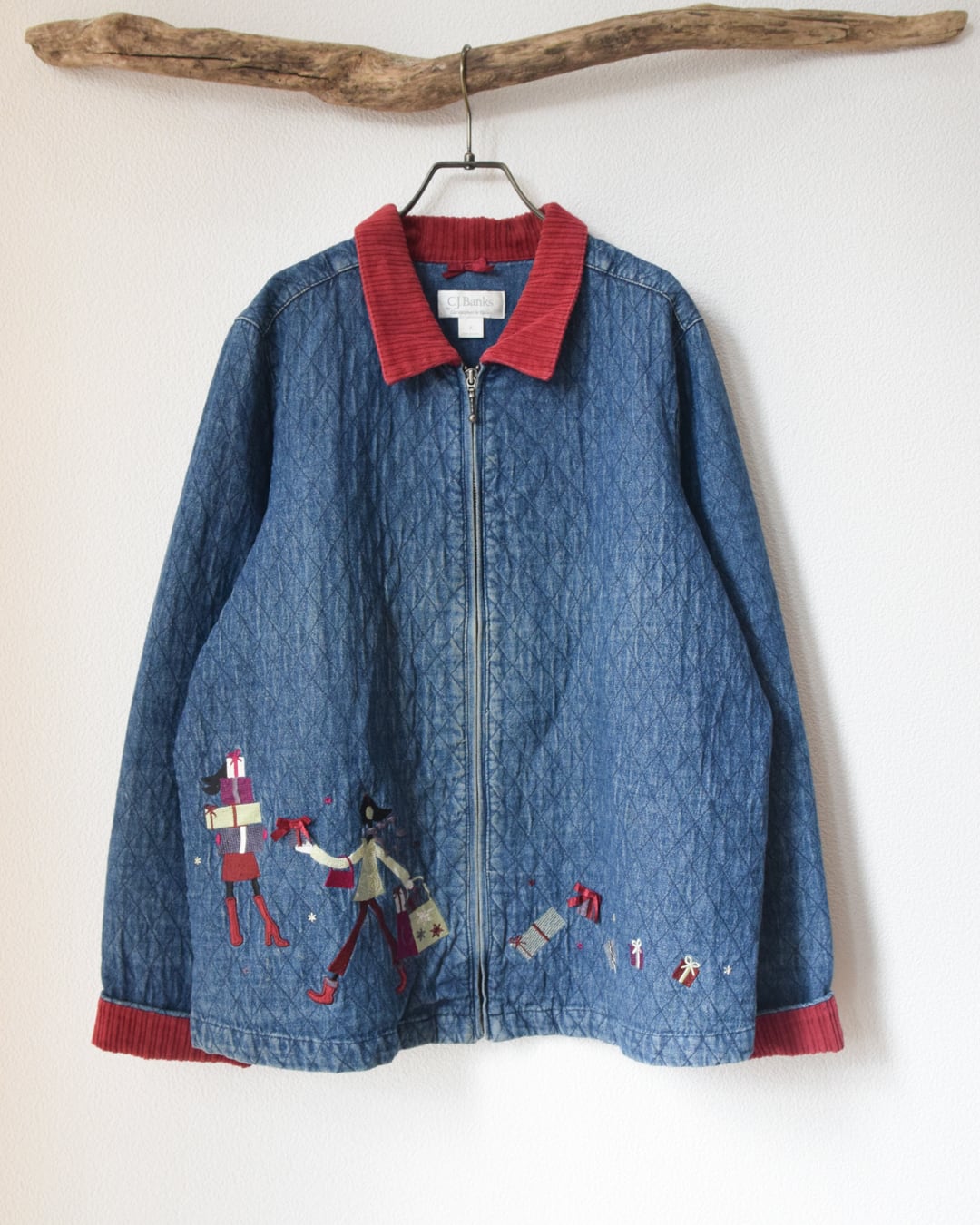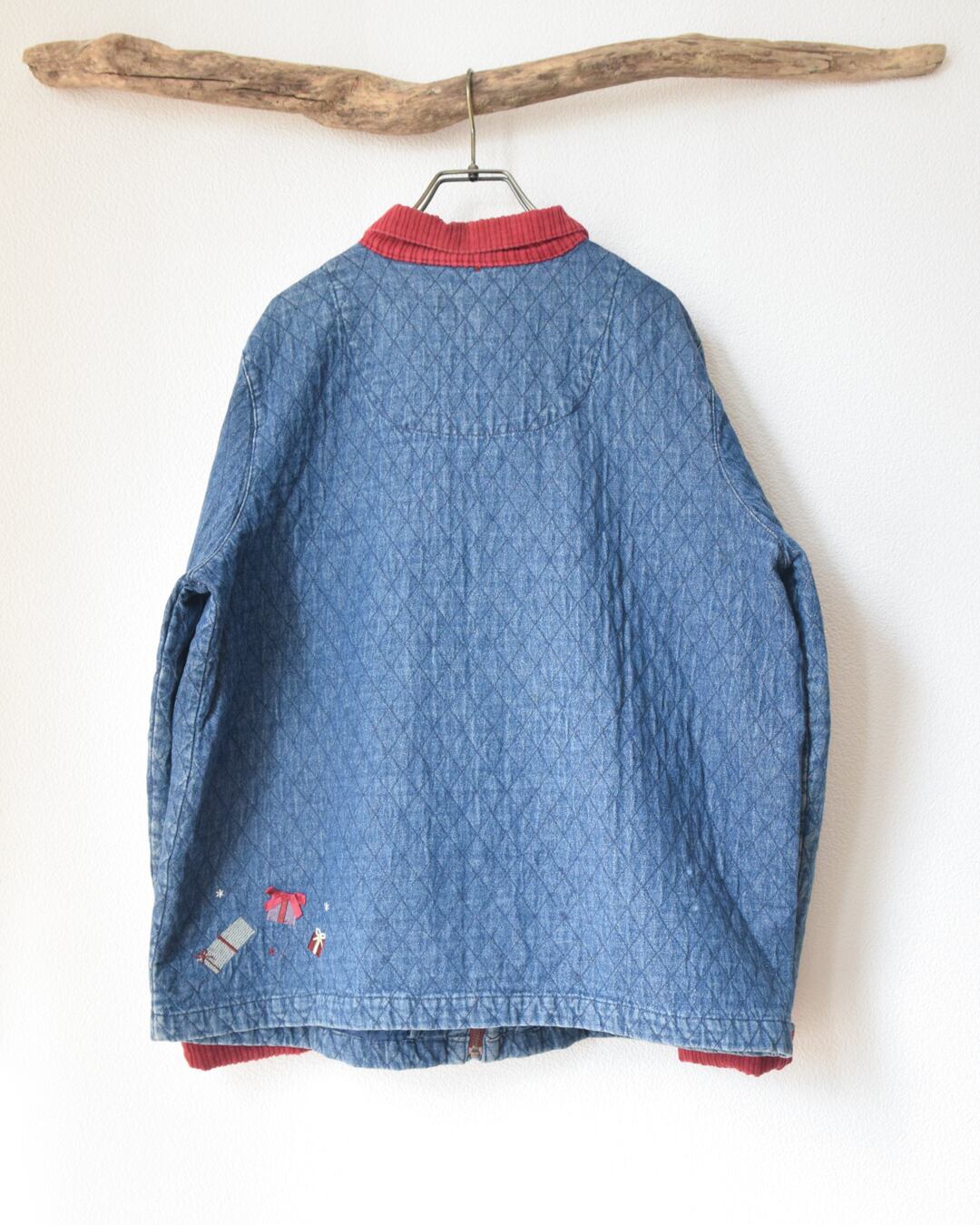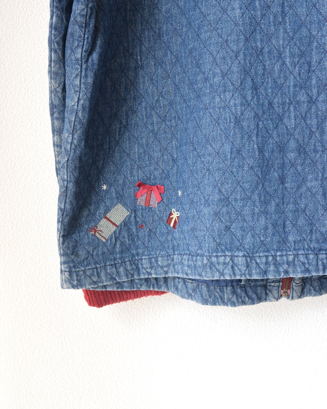 両面に刺繍デザインが施されており、襟が赤のコーデュロイ素材で切り替えになっています。