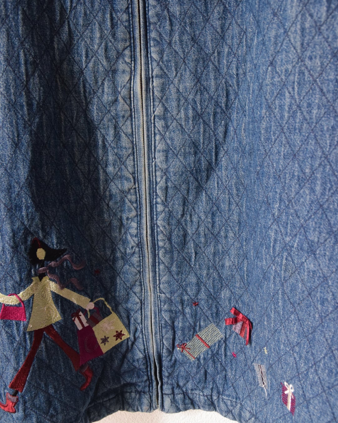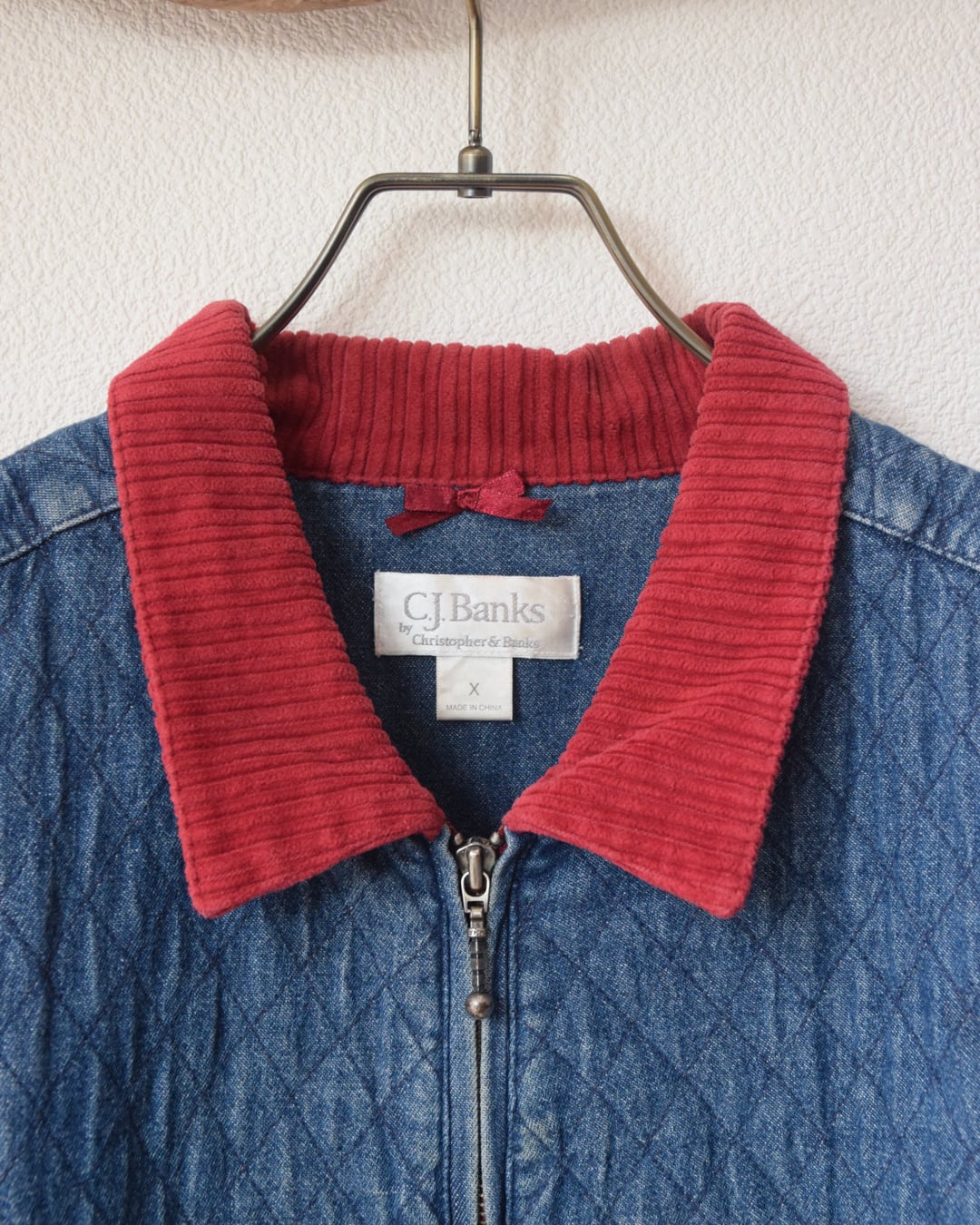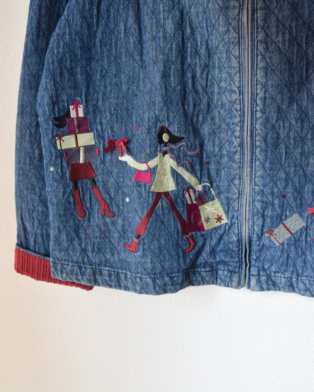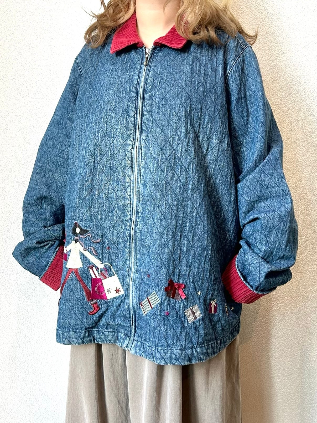 両面に刺繍デザインが施されており、襟が赤のコーデュロイ素材で切り替えになっています。