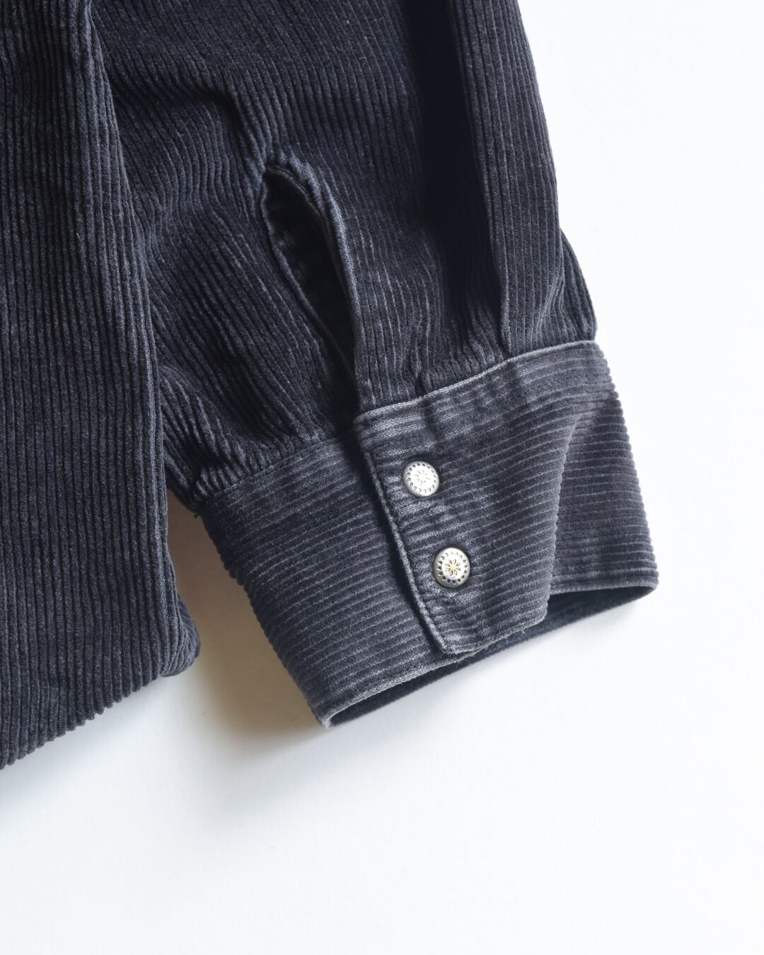 フロントは特徴的なデザインのボタンが2連で配置されており、ブラックのシャツに対してシるバーのボタンが良いアクセントになっています。