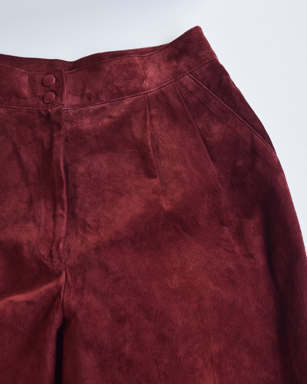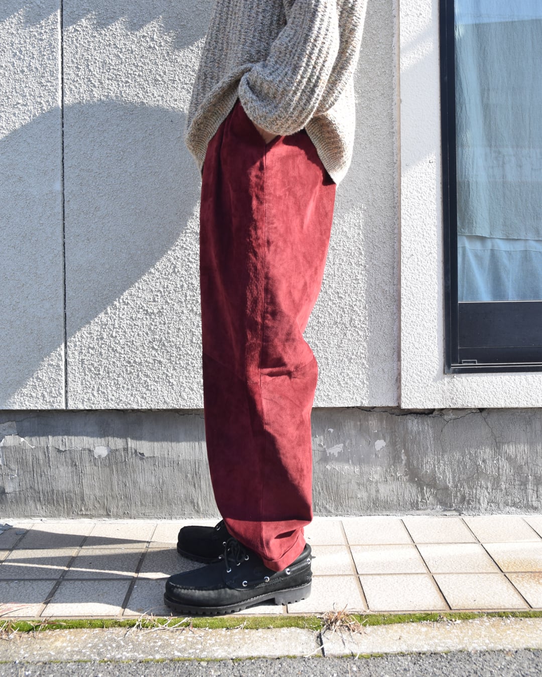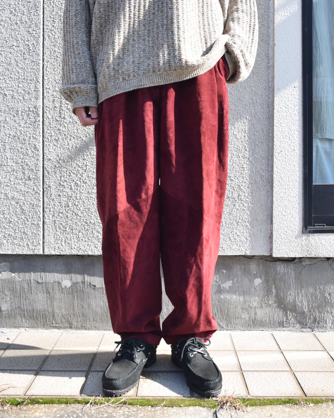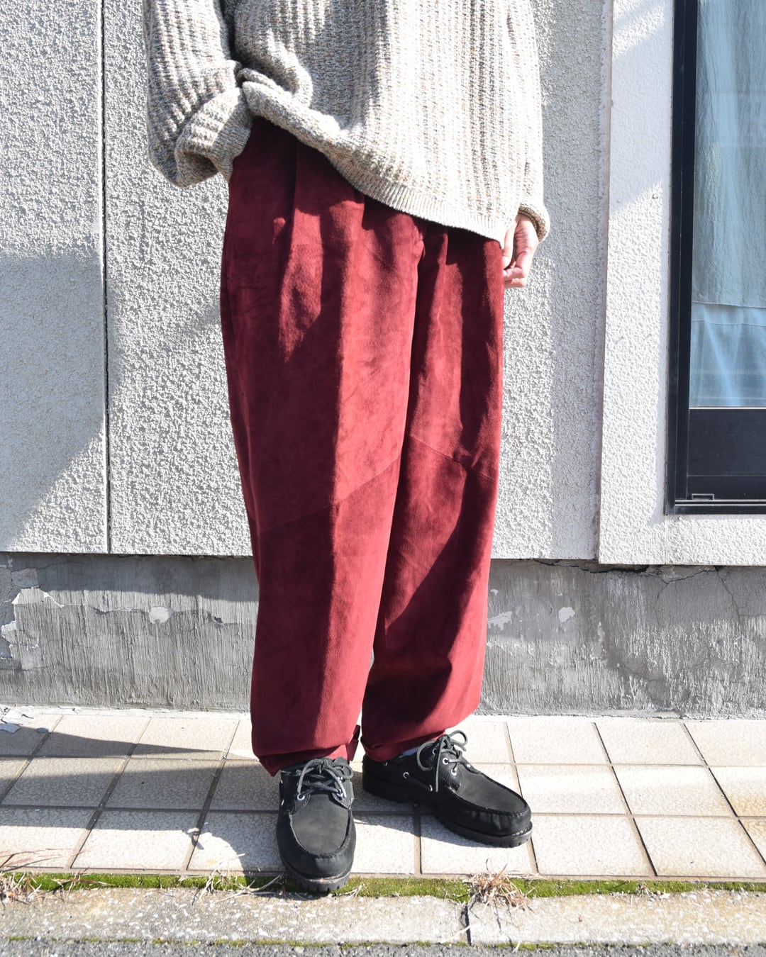 柔らかく滑らかなピッグスウェード生地のワイドテーパードパンツ。