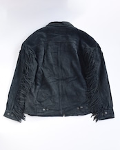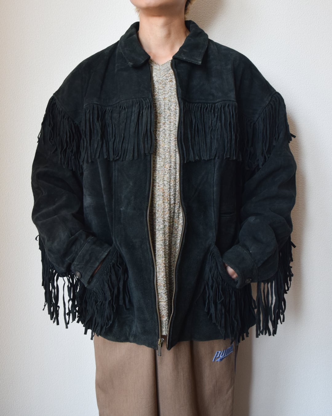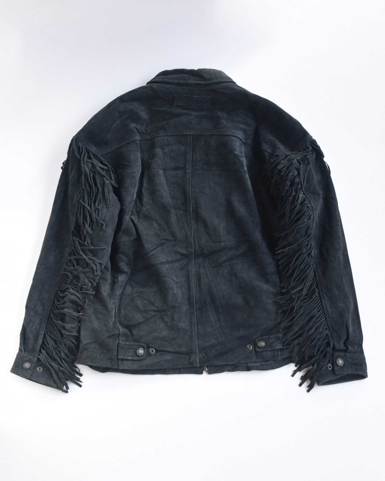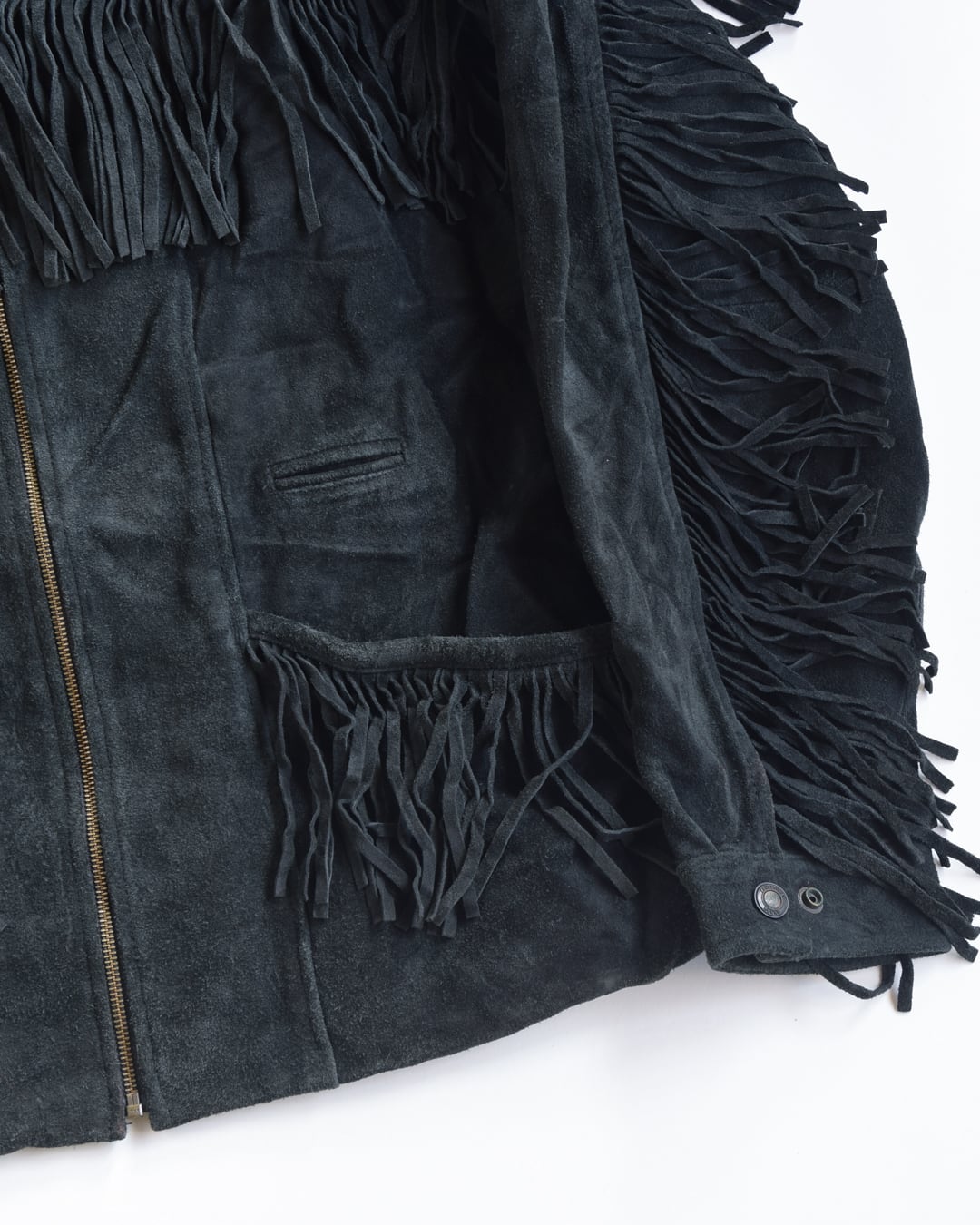 フロント、バック、袖、ポケットにフリンジがついたスウェードジャケット。