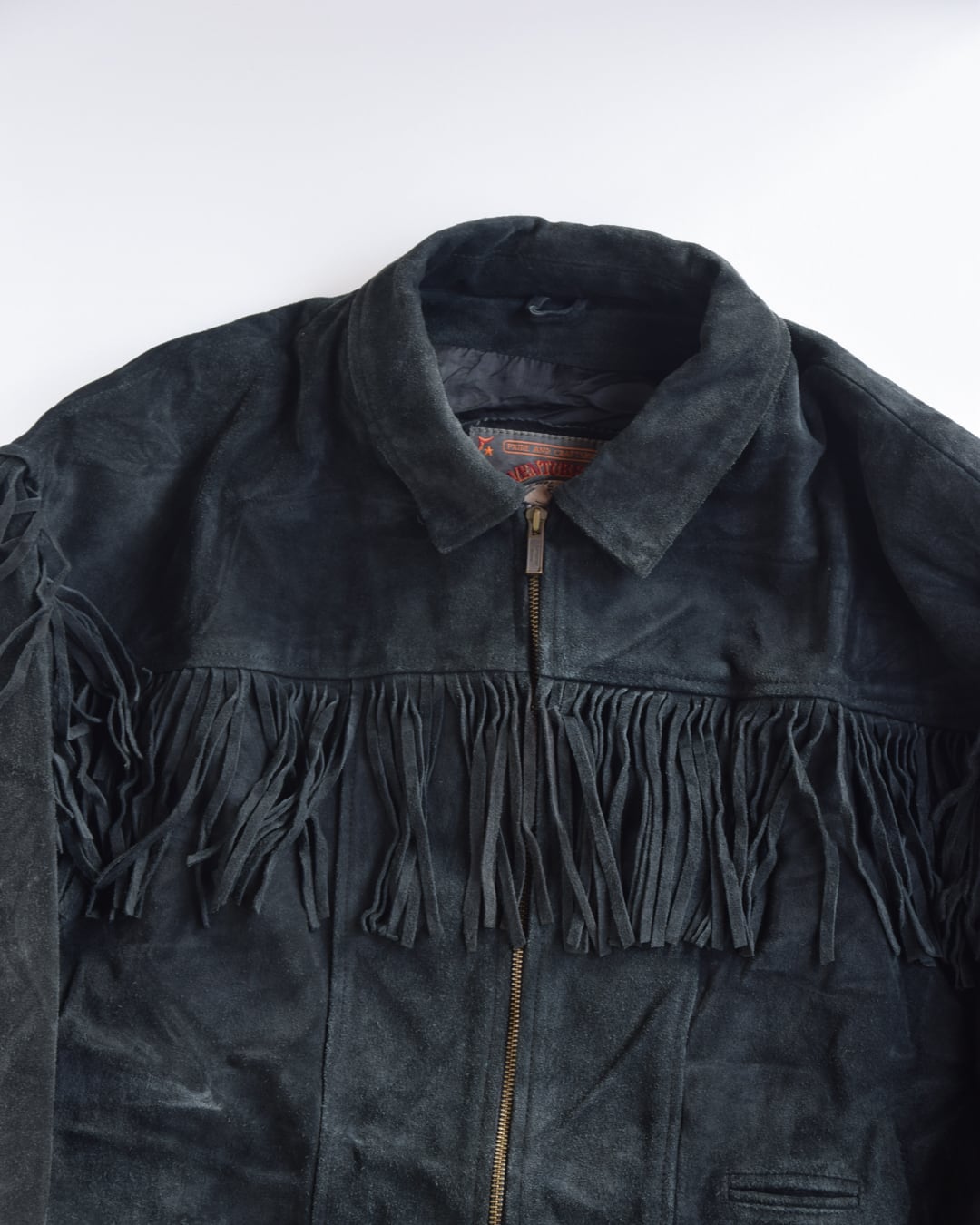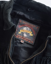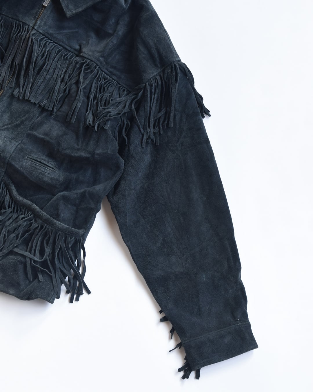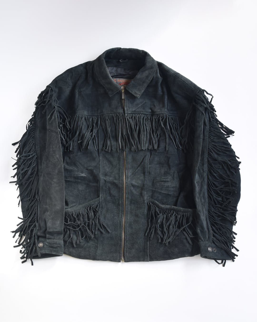 フロント、バック、袖、ポケットにフリンジがついたスウェードジャケット。