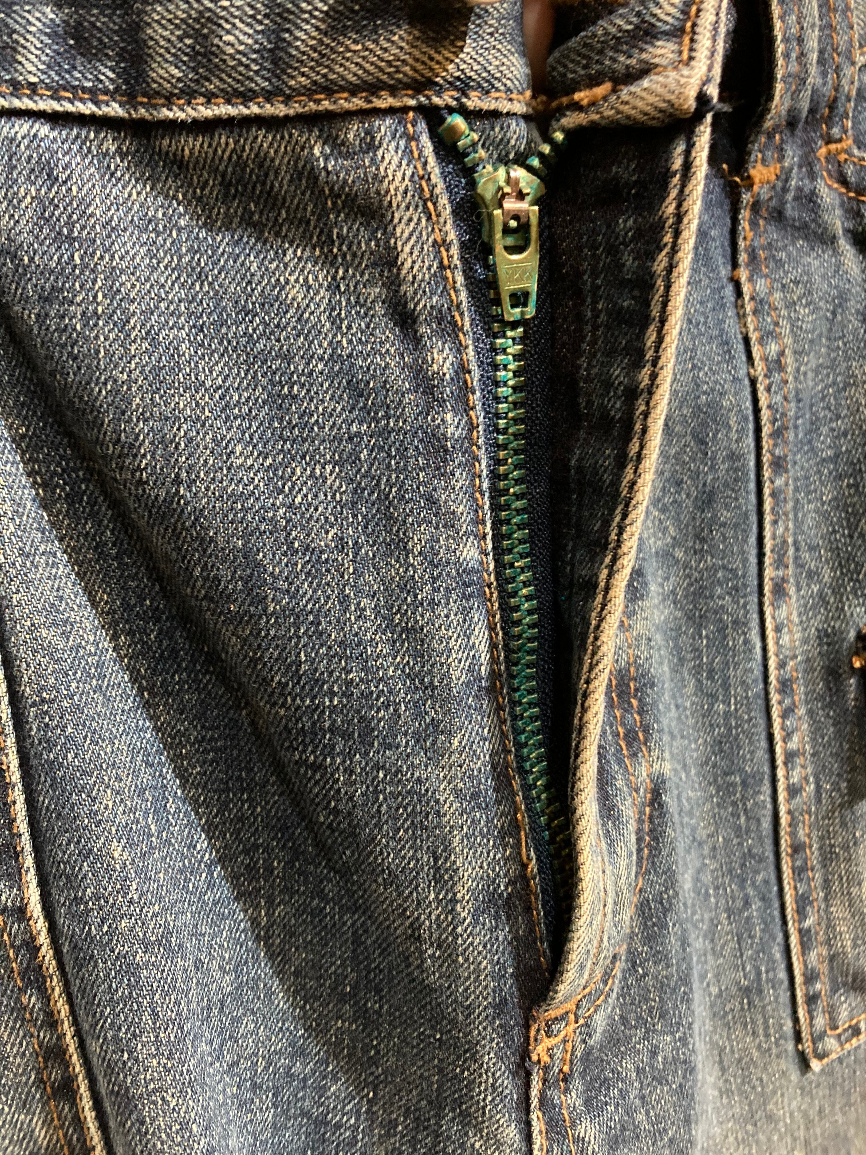 ポケットのボタン、ファスナーが青く変色しています。