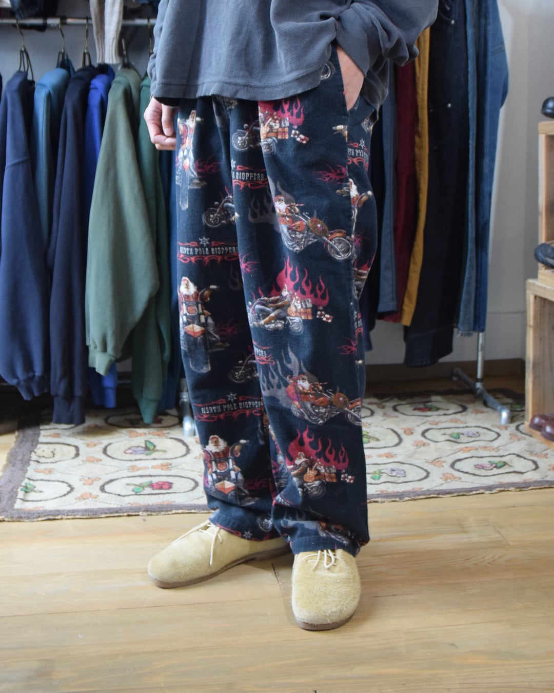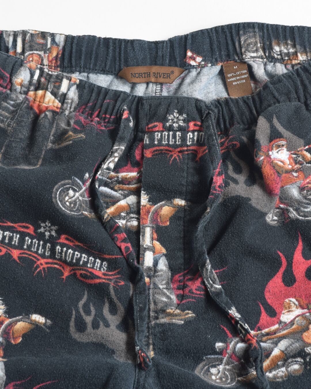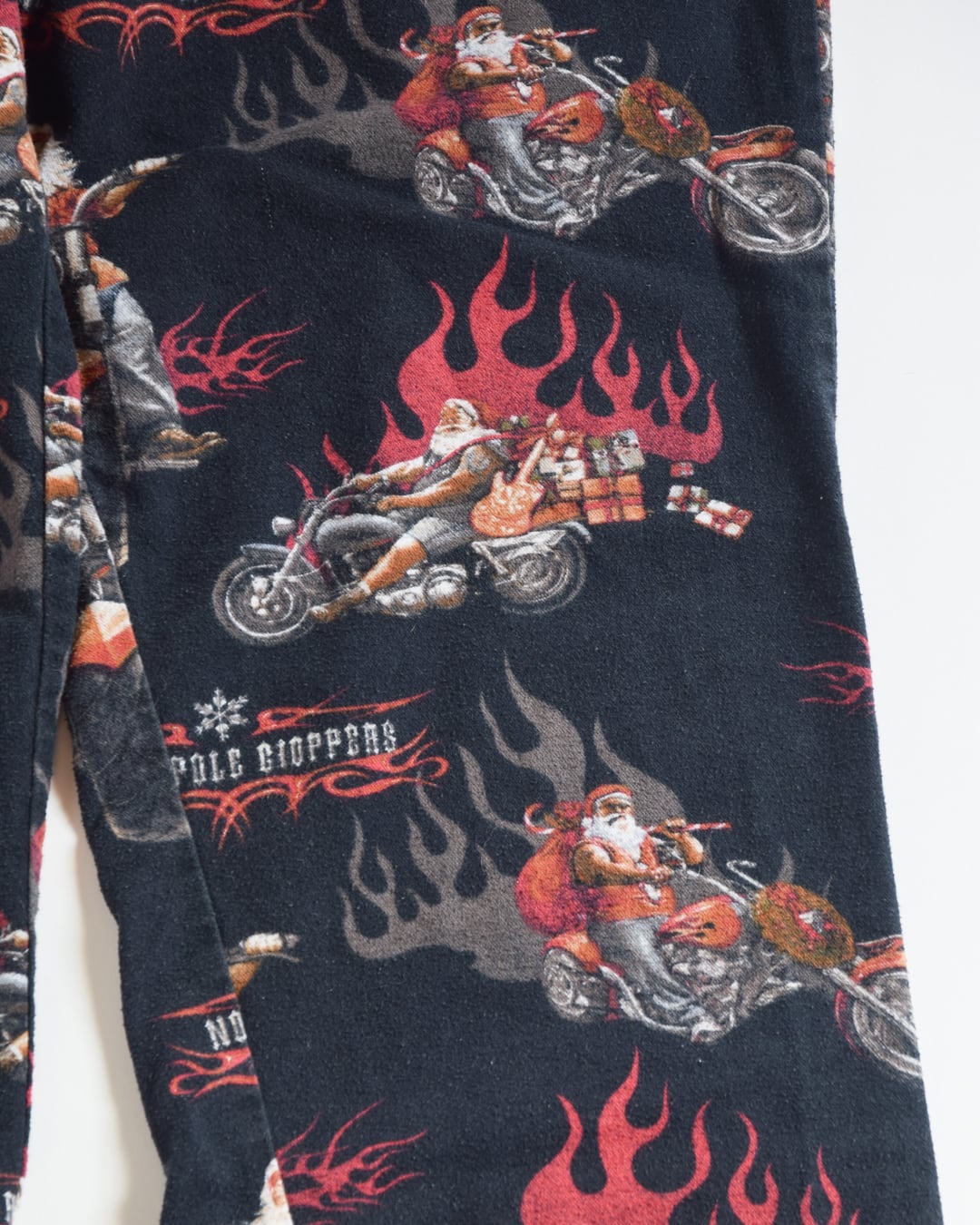 サンタクロースがバイクに乗ったデザインのパジャマパンツ。