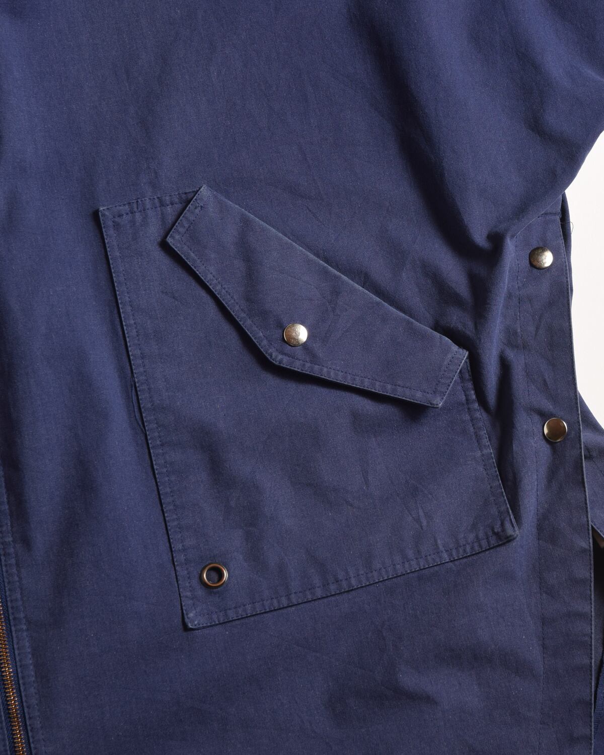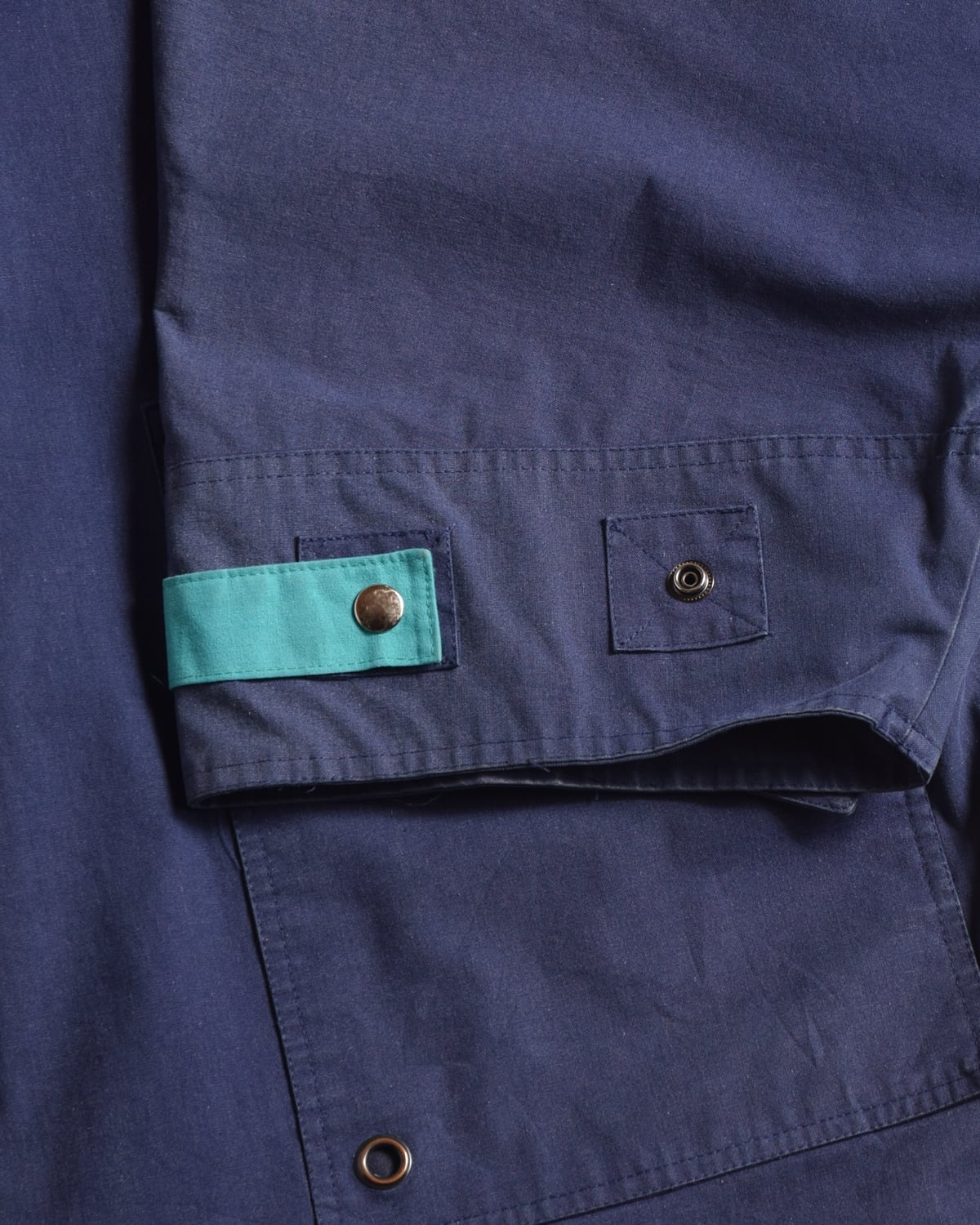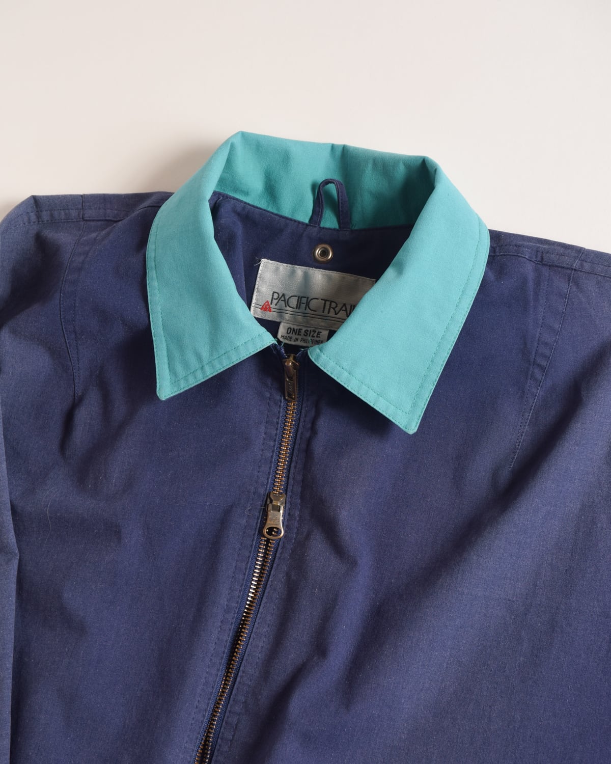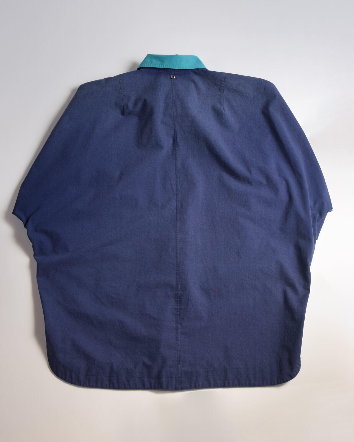 ネイビーのボディに、襟と袖の青緑が映えるレトロな配色。