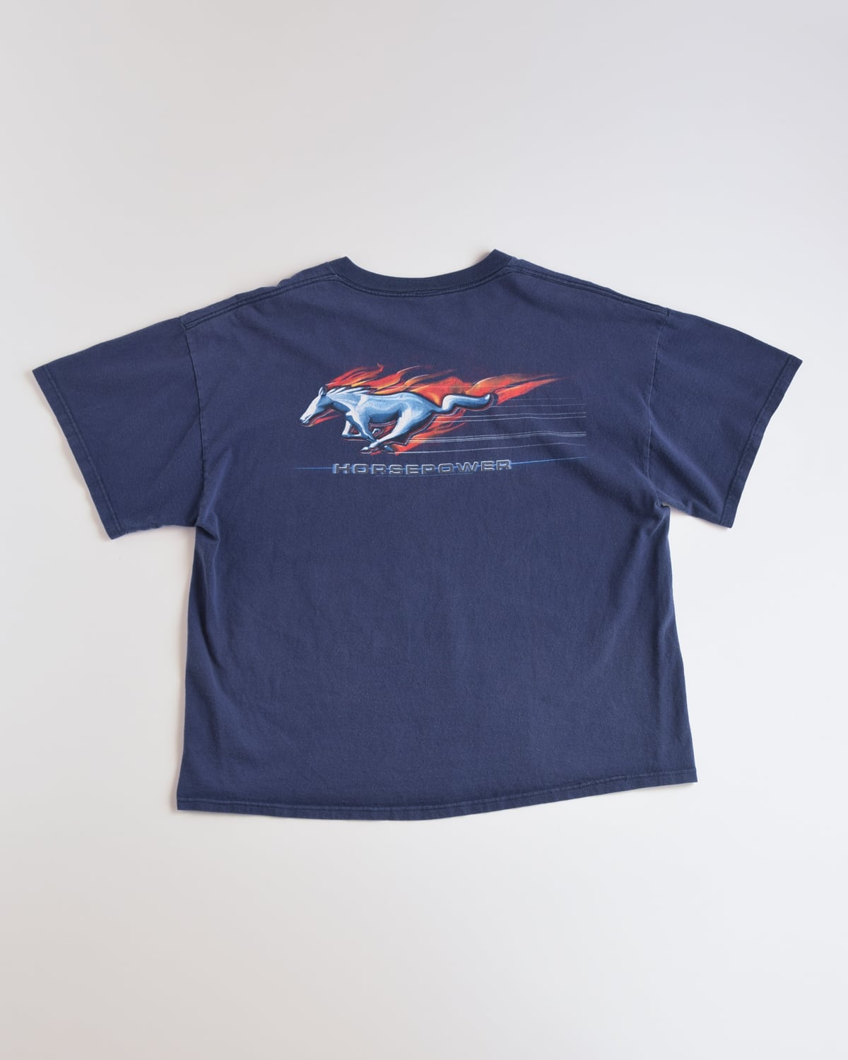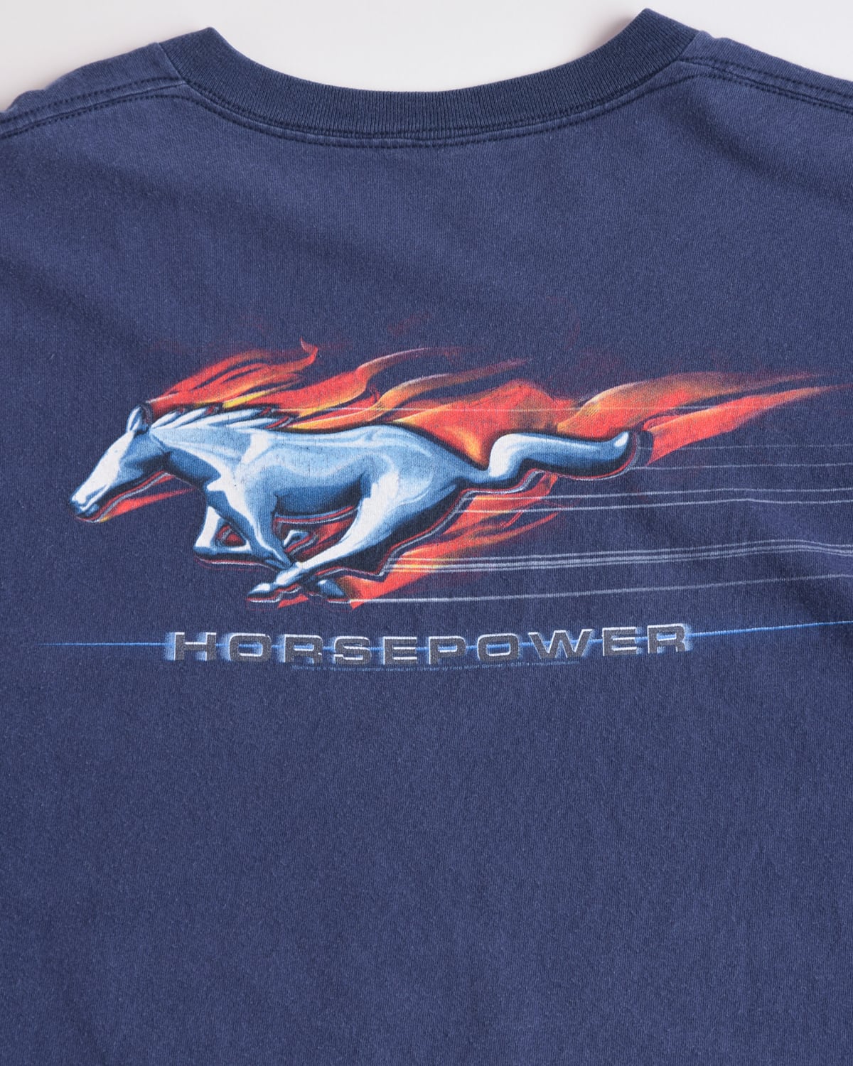 バックにはマスタングの象徴である「ギャロッピング・ホース」が炎を纏って疾走するグラフィックがプリントされたデザイン。